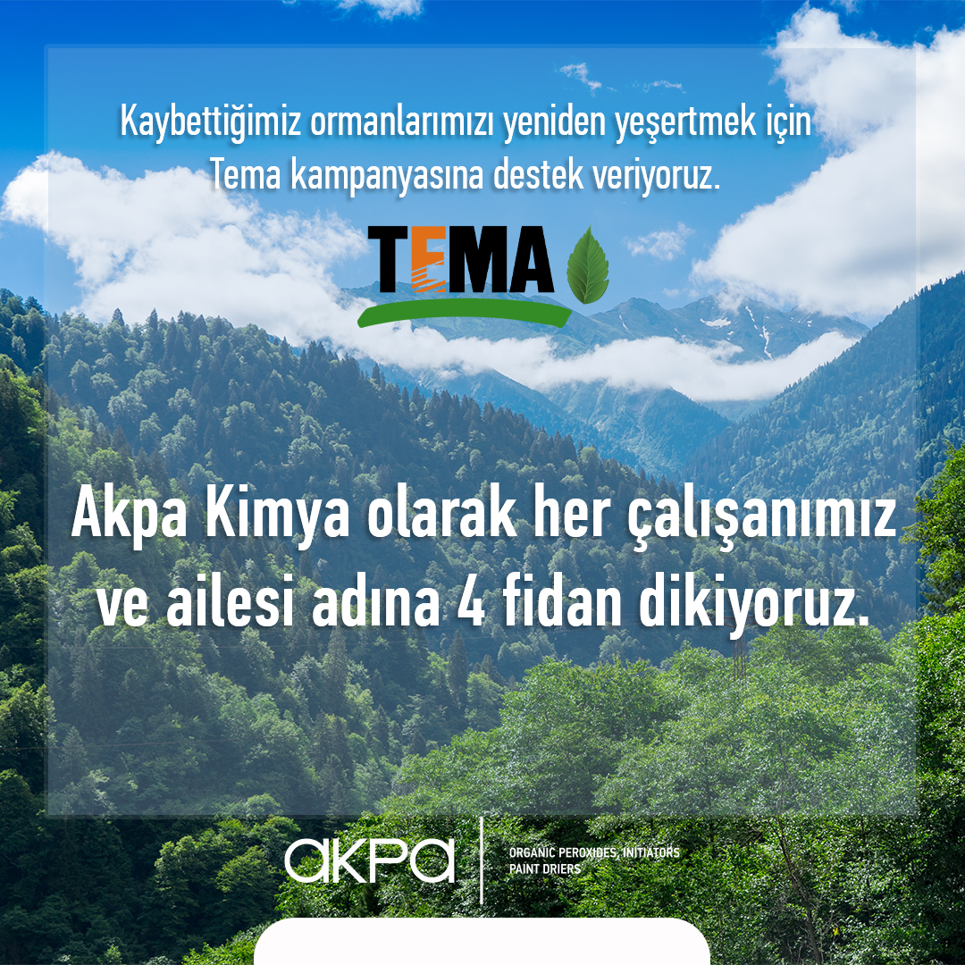 Nach den Waldbränden im Jahr 2021 unterstützte AKPA Kimya den Aufruf der TEMA-Stiftung "Lasst uns das Leben neu bepflanzen" und spendete im Namen aller unserer Mitarbeiter und ihrer Familien vier Setzlinge, um unsere verlorenen Wälder wieder zu bepflanzen (30. Juli 2021). Die Gesamtzahl der gespendeten Bäumchen beträgt 888.